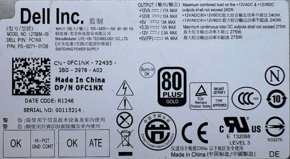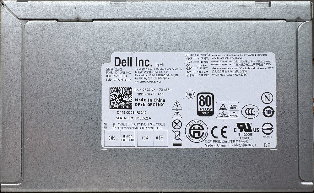 Dell L275EM-00 275W ATX PC tápegység 8 cm-es hűtőventilátorral FC1NX PS-6271-01DB