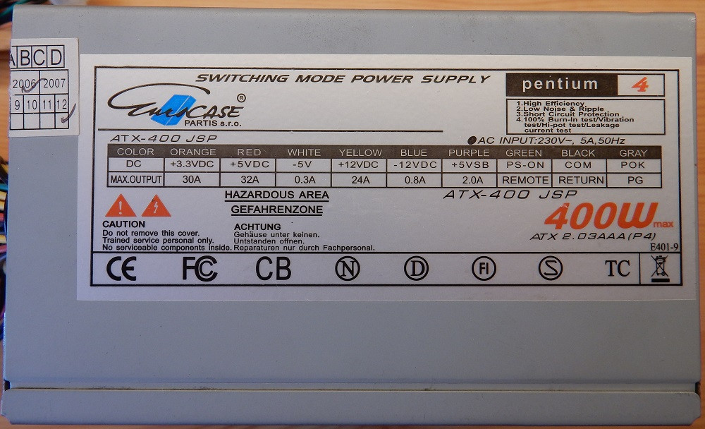 Eurocase ATX-400 JSP 400W ATX PC tápegység 12 cm-es hűtőventilátorral 2006