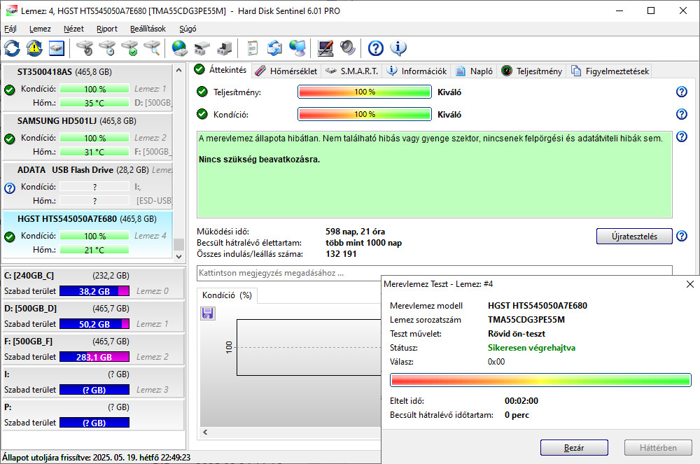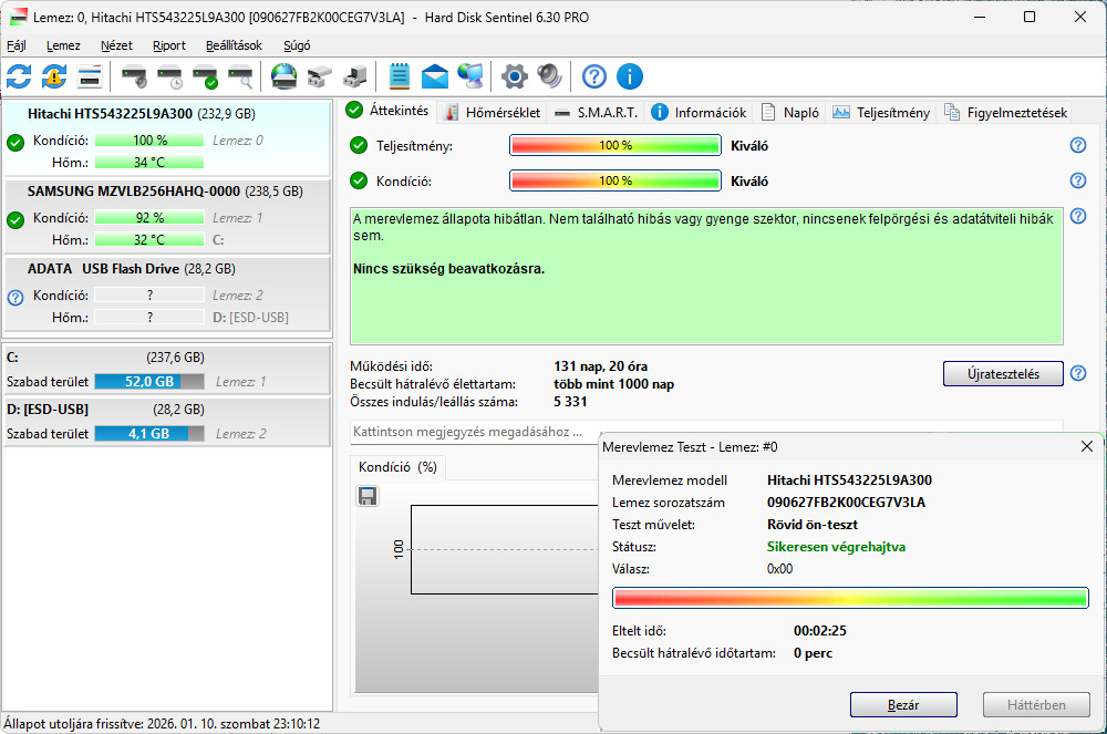 A merevlemez állapota hibátlan. Nem található hibás vagy gyenge szektor, nincsenek felpörgési és adatátviteli hibák sem.