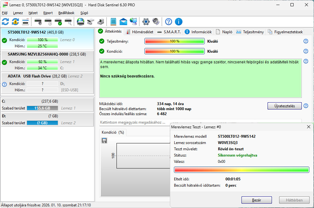 A merevlemez állapota hibátlan. Nem található hibás vagy gyenge szektor, nincsenek felpörgési és adatátviteli hibák sem.