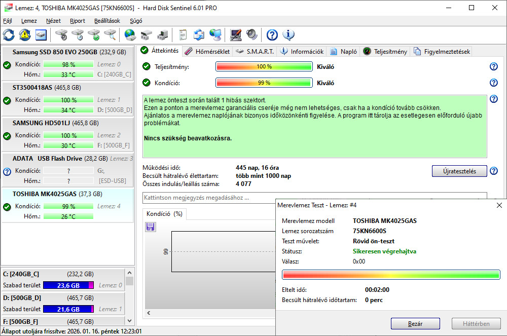 A lemez önteszt során talált 1 hibás szektort.