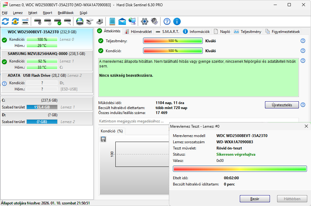 A merevlemez állapota hibátlan. Nem található hibás vagy gyenge szektor, nincsenek felpörgési és adatátviteli hibák sem.