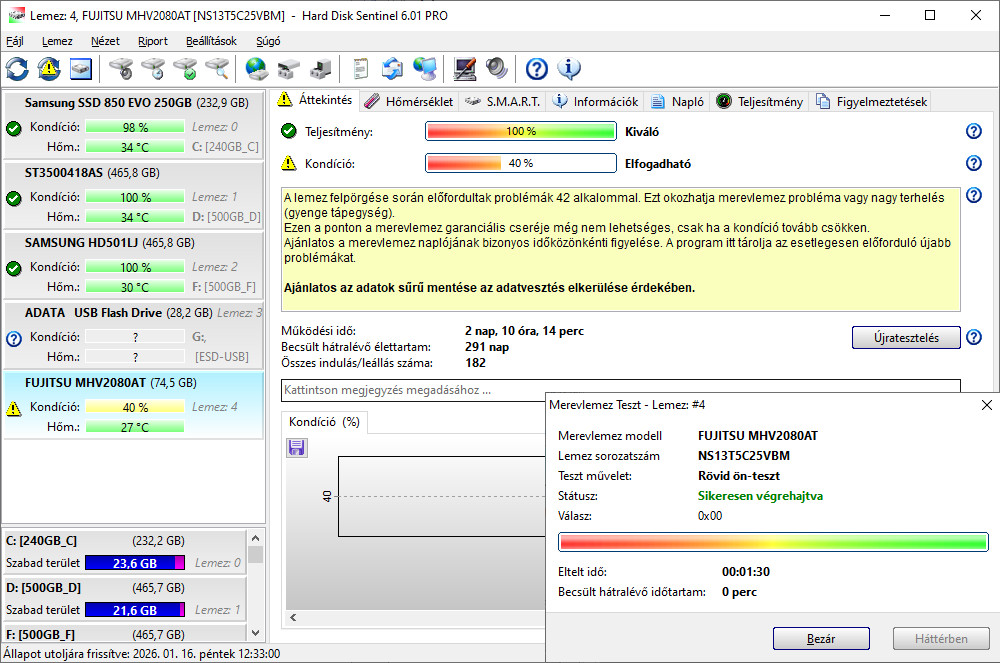 A lemez felpörgése során előfordultak problémák 42 alkalommal. Ezt okozhatja merevlemez probléma vagy nagy terhelés (gyenge tápegység).
